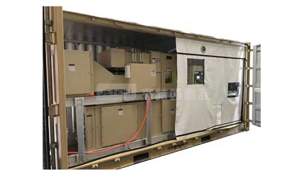 本设备最终安装在20尺(集装箱内部尺寸:5.89x2.35x2.38(长宽高))的集装箱内,并和罗茨风机连接设备额定风量为2500风量,出风温度40摄氏度,湿度:露点温度为-20度。设备整体做成一个集装箱的样式,所有部件都在集装箱内部,便于运输,用于天然气管道除湿。在野外,外部环境很恶劣的地方造成了很大程度程度上的局限性,而本设备自带供电系统,利用柴油机和发电机很好的解决了这一刚性条件,全部部件都放在集装箱里面,保证了系统的稳定性,设备的流动性!